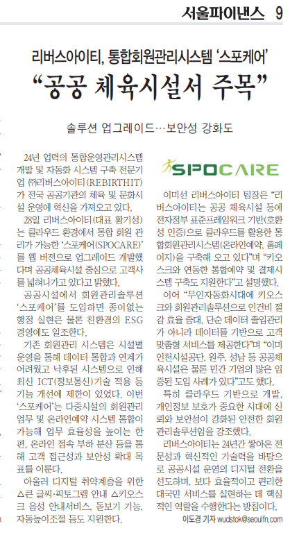 관련 기사 본문 URL : (1) 리버스아이티, 통합회원관리시스템 '스포케어'···"공공체육시설서 주목"